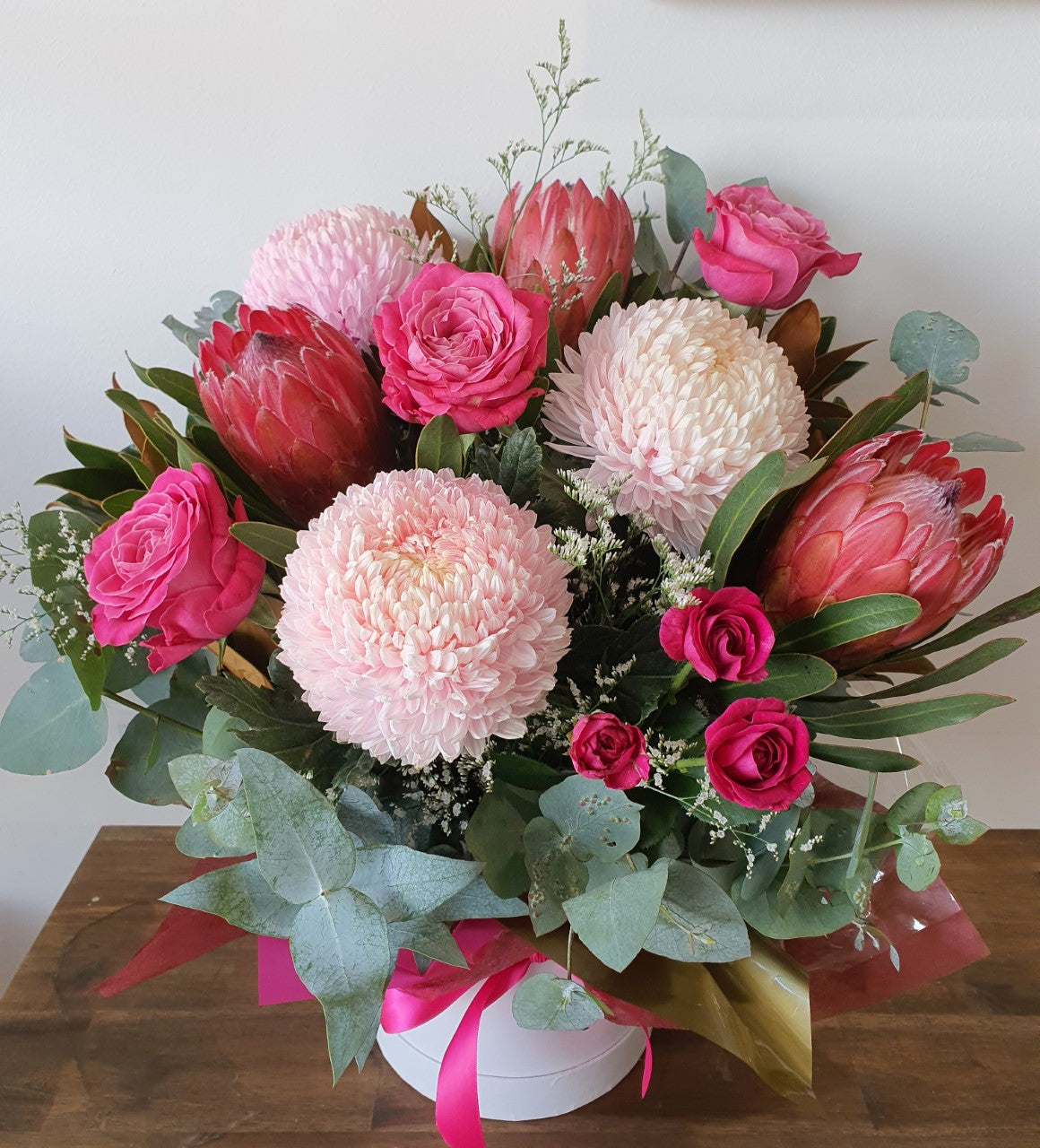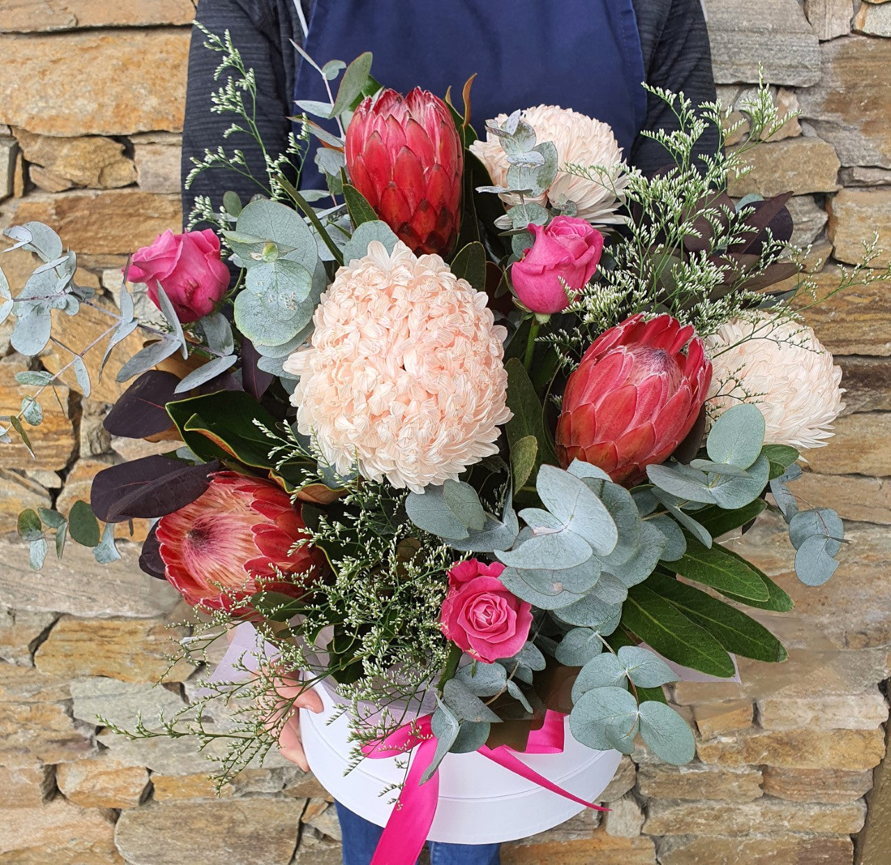 Stunning large hatbox arrangement featuring Proteas, Disbuds and Roses.