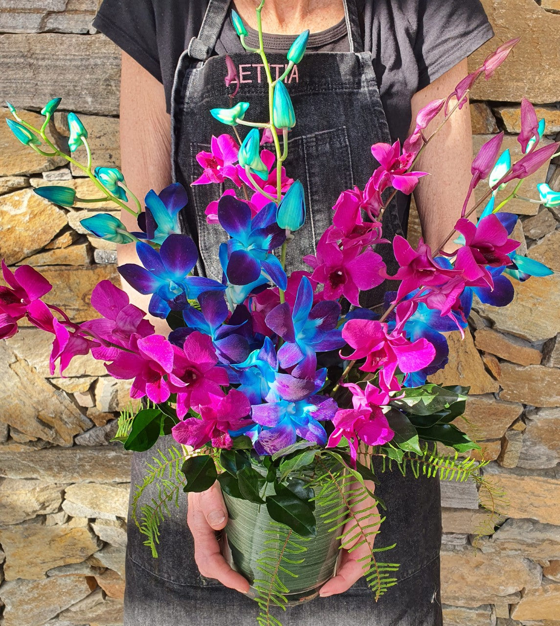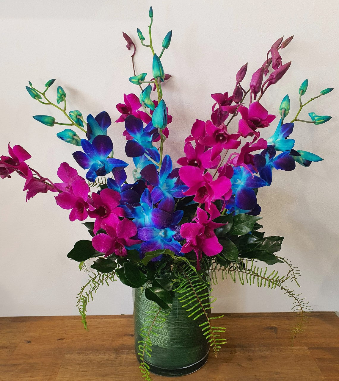 A stunning mix of Blue Galaxy and Purple Dendrobium Orchids supplied in a glass vase.